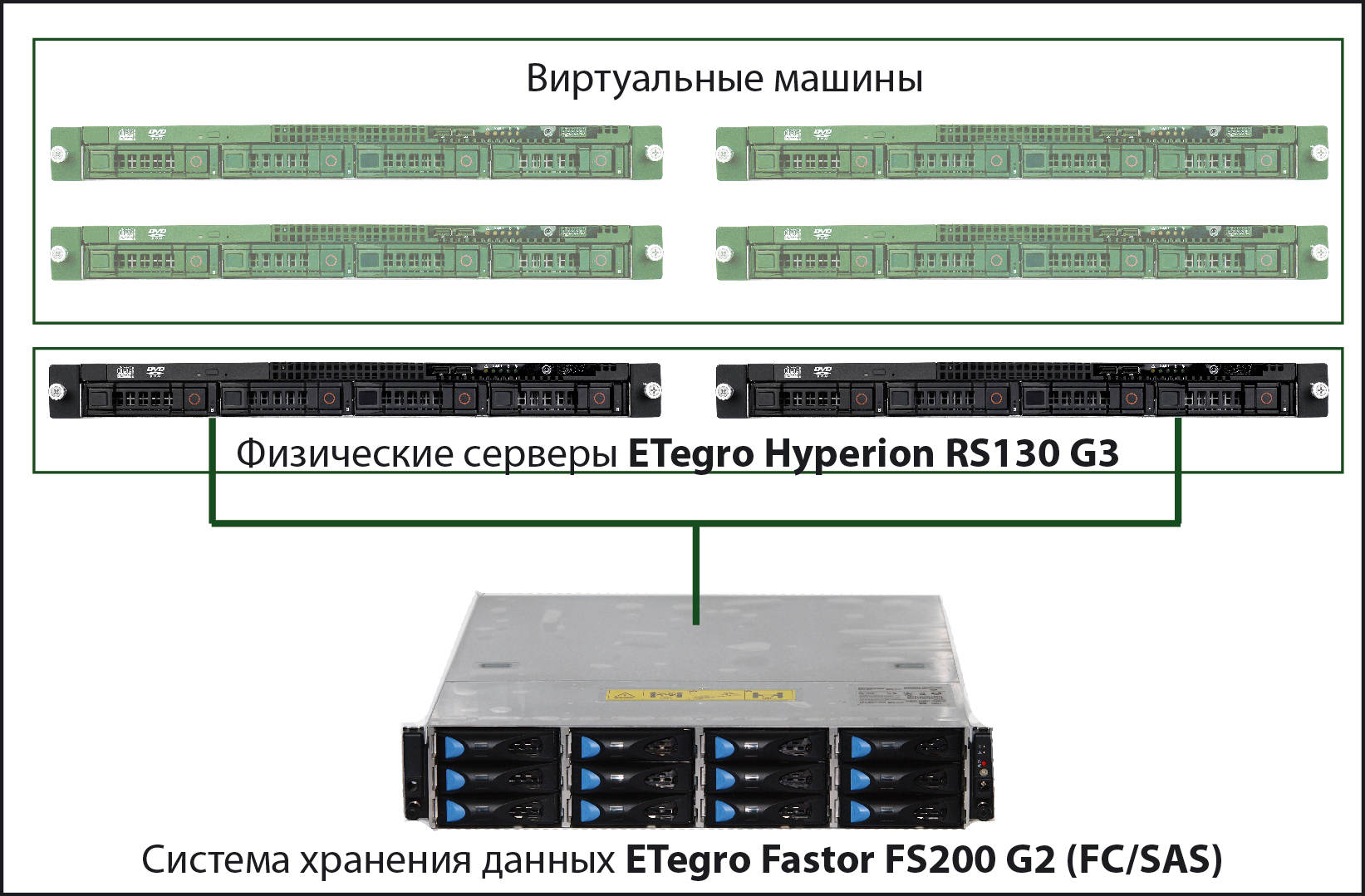 2 сервера ETegro Hyperion RS130 G3 используются в варианте кластера, для хранения данных применяются СХД корпоративного уровня из линейки ETegro Fastor.